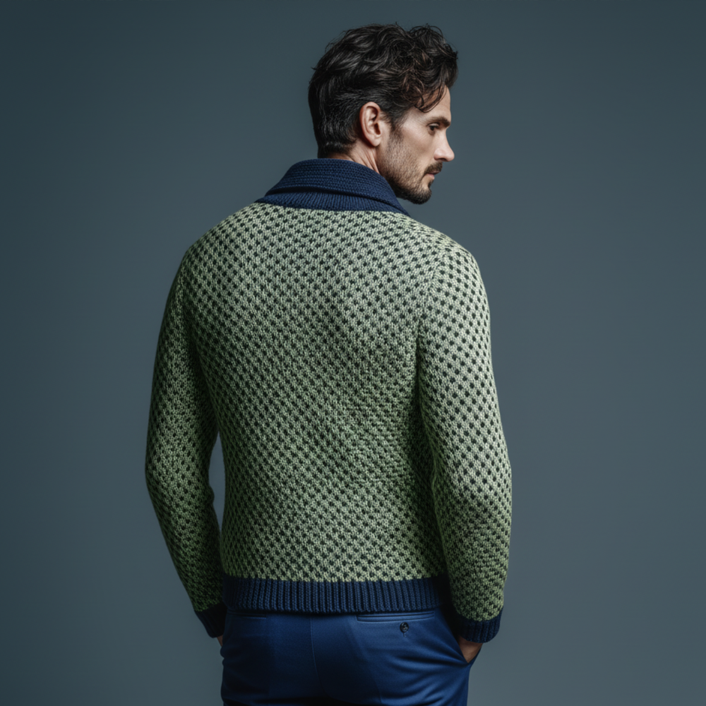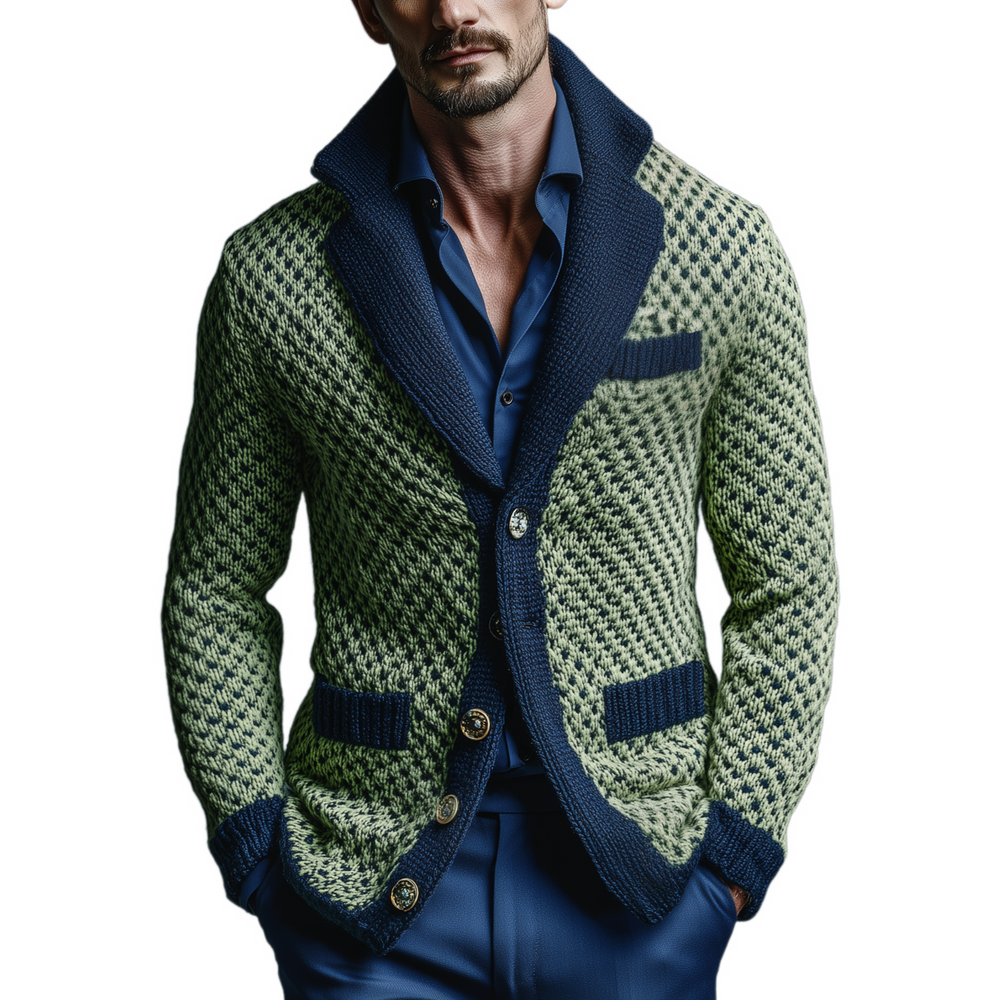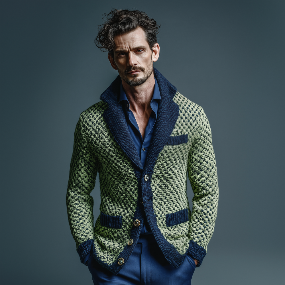 Product Name:Men's Classic Casual Lapel Green And Navy Blue Slim Jacquard Knit Cardigan