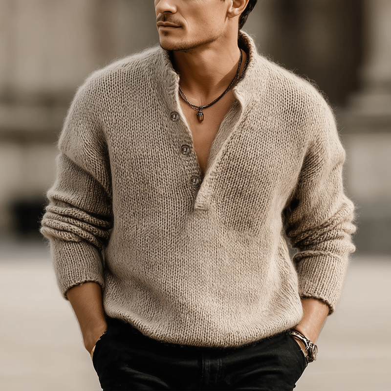 The Men's Classic Light Khaki Button-up Stand-collar Knitted Sweater is a refined piece that combines comfort and style in a classic design. Its light khaki color provides a versatile and timeless appeal, making it an essential addition to any wardrobe.