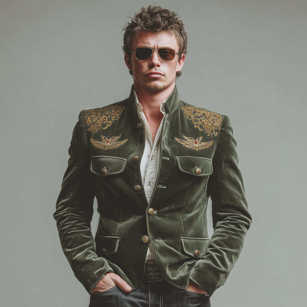 The Men’s Classic Retro Embroidered Faux Velvet Stand Collar Jacket fuses vintage charm with modern tailoring. With its embroidered detailing, plush faux velvet, and versatile layering potential, it serves as a refined outer layer for smart-casual to casual-western looks across seasonal transitions.