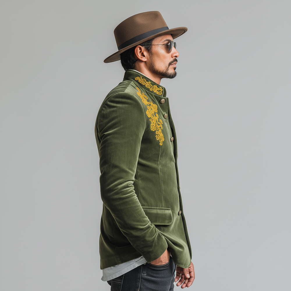 The Men’s Classic Retro Stand Collar Embroidered Faux Velvet Slim Fit Jacket offers a refined blend of retro charm and modern tailoring. With its embroidered detailing, plush velvet texture, and versatile layering potential, it serves as a stylish outer layer for smart-casual to dressier looks across seasonal transitions.