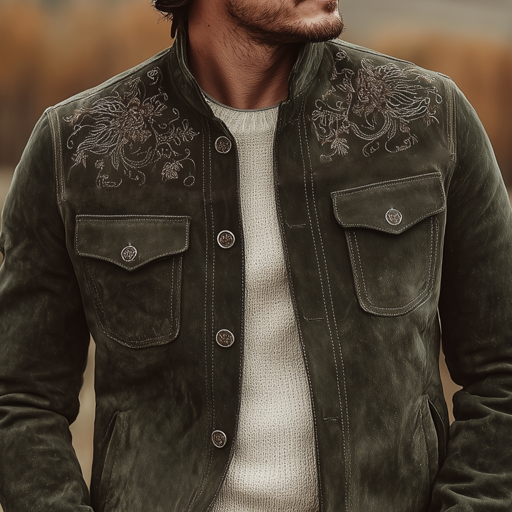 The Men’s Classic Retro Western Style Embroidered Stand-up Collar Faux Suede Jacket offers a refined yet rugged layering option with distinctive embroidery. Its faux suede body, stand-up collar, and Western-inspired detailing make it a dependable choice for elevating casual, smart-casual, and transitional outfits across seasons.
