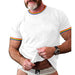 Introducing our Men's Rainbow Stripe Patchwork Round Neck Short Sleeve T-Shirt, a vibrant and stylish addition to your wardrobe.