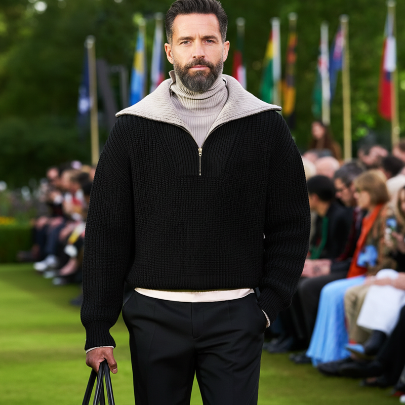 This versatile sweater pairs well with both casual and semi-formal outfits. Dress it up with tailored trousers and leather shoes for a smart look, or go casual with jeans and sneakers for a more laid-back vibe. The zipper collar can be left open for a relaxed look or zipped up for a more polished appearance.