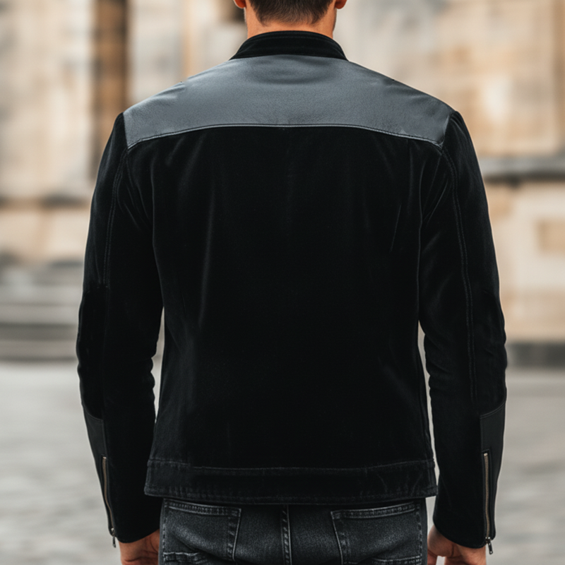 Velvet and PU Leather Mix: The unique combination of soft velvet and sleek PU leather gives this jacket a luxurious yet edgy look.
